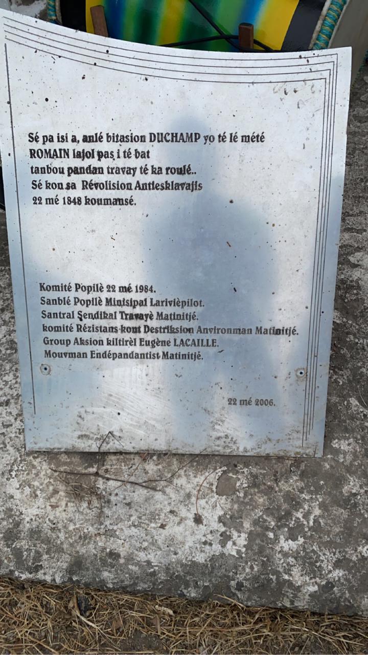 Saint-Pierre / Sainte-Philomène - 22 mai 2023. En cette journée de commémoration des 175 ans de l’abolition de l’esclavage, les militants de MARTINIQUE ÉCOLOGIE ont choisi de rendre hommage à l’esclave Romain non loin de l’Habitation Duchamp lieu de départ de l’insurrection du 22 mai 1848.