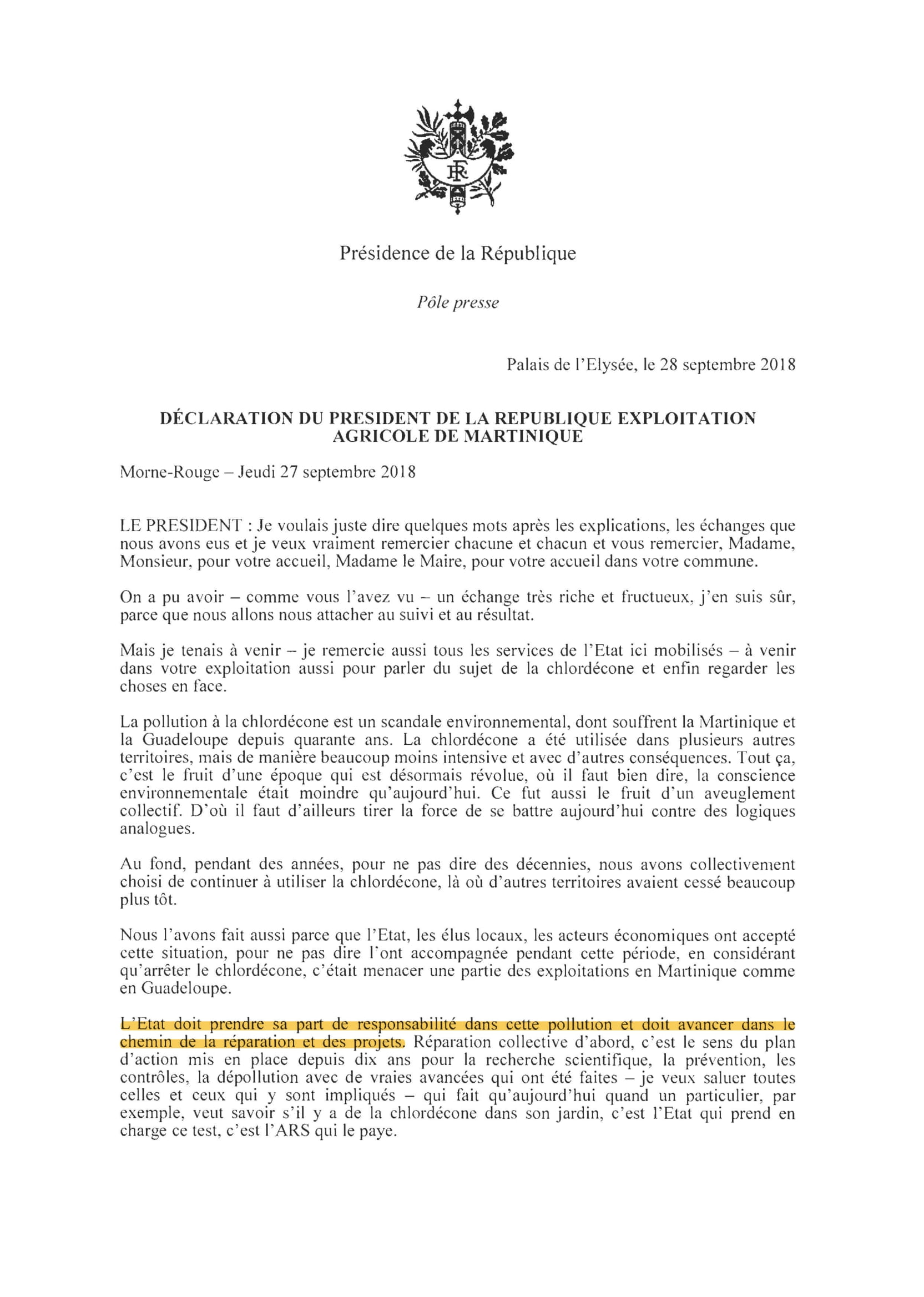 Morne-Rouge (Martinique) – 27 septembre 2018. Déclaration publique du Président de la République, Emmanuel MACRON, sur une exploitation agricole en présence d’exploitants agricoles et d’élus martiniquais. « L'Etat doit prendre sa part de responsabilité dans cette pollution et doit avancer dans le chemin de la réparation et des projets ». En introduisant un pourvoi en cassation le 9 mai 2025 contre un récent arrêt visant à établir sa responsabilité fautive, l’État vient d’infliger un cinglant désaveu au … Chef de l’État représenté par le Président Emmanuel Macron. Un chef d’œuvre d’incohérence et une situation pour le moins rocambolesque qui illustrent bien à quel genre d’imbroglio juridique peut conduire des années d’inertie judiciaire où les victimes attendent toujours la réparation de leur préjudice.