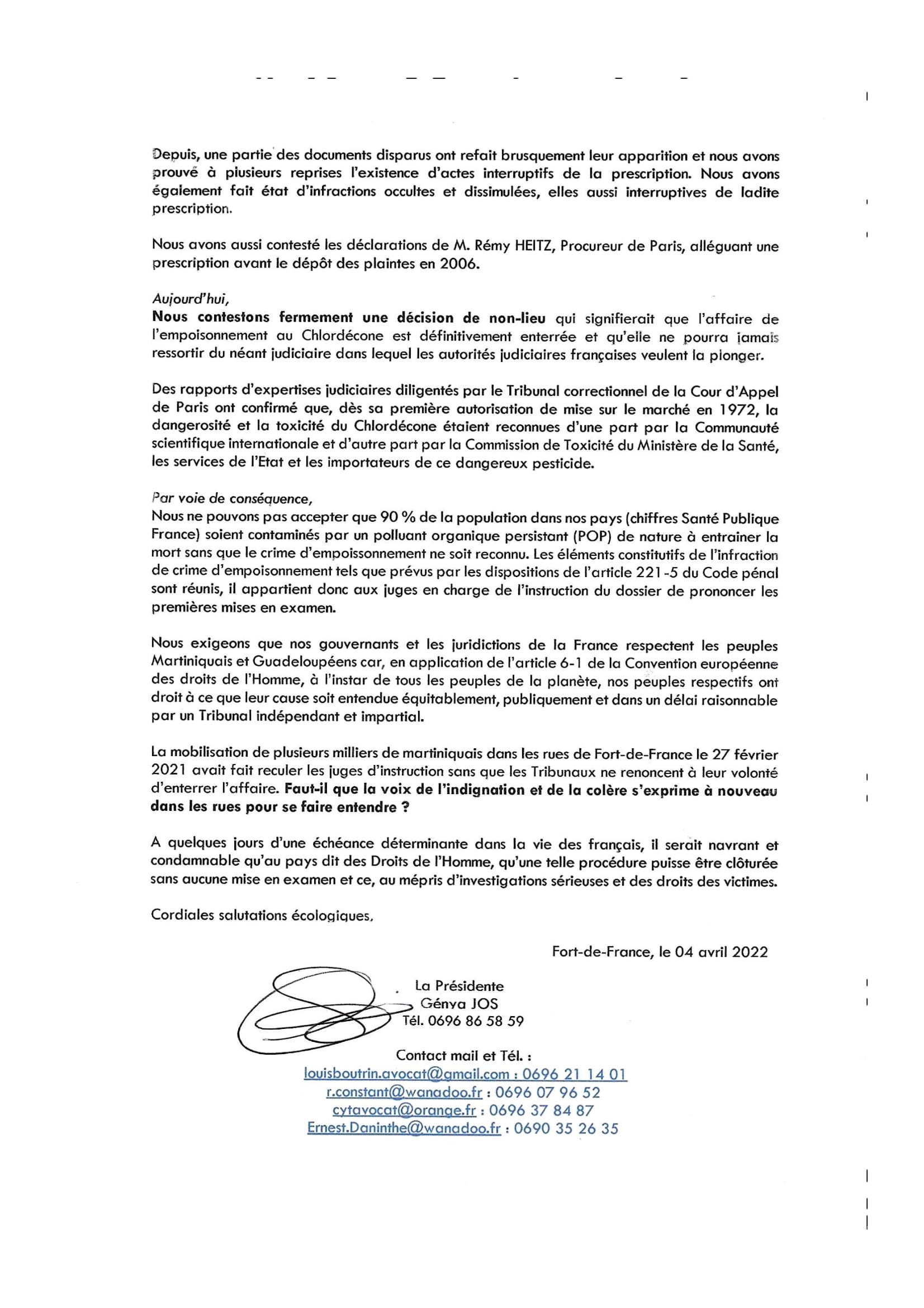 Aujourd’hui, Nous contestons fermement une décision de non-lieu qui signifierait que l’affaire de l’empoisonnement au Chlordécone est définitivement enterrée et qu’elle ne pourra jamais ressortir du néant judiciaire dans lequel les autorités judiciaires françaises veulent la plonger.