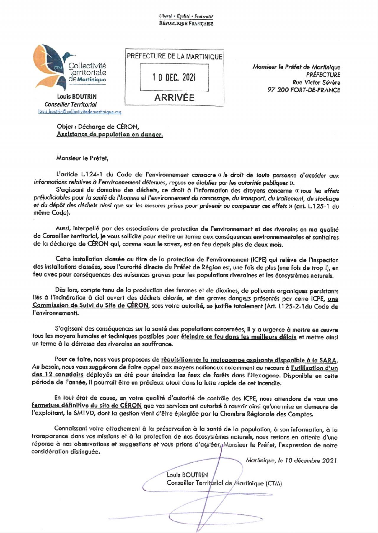DIAMANT - 11 déc. 2021. FORUM CITOYEN - CÉRON. Organisé au quartier Taupinière par les militants Diamantinois de Martinique-Écologie (M.E.), ce Forum-Citoyen a été un moment fort d’échanges et de propositions fructueuses autour de la brûlante question des nuisances liées à la décharge de Céron. Après une présentation liminaire où sont intervenus tour à tour, Louis Boutrin (Pt de M.E. - Avocat), Jacques De Thoré (M.E. Pneumologue), Marie-Frédérique Adréa-Lordinot (M.E. Expert-Comptable) et Raphaël Confiant (Vice-Président de M.E. - Écrivain) les riverains présents ont exprimé leur incompréhension et leur colère face à l’inertie administrative et politique. Fort de son expérience à la CTM, Louis Boutrin a brossé l’état des lieux de la gestion des déchets en Martinique et a mis au débat la question de la responsabilité du SMTVD et du Préfet dans la situation de détresse et de souffrance des riverains. Un nouveau scandale environnemental et sanitaire sous nos latitudes qui pose, entre autres, la question de la Non-Assistance à population en danger d’où l’interpellation du Préfet par le Conseiller Territorial (voir PJ).