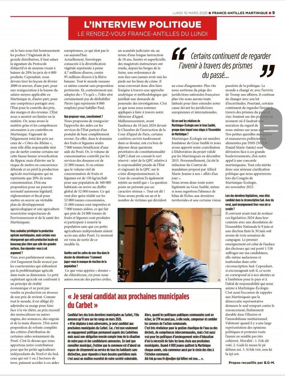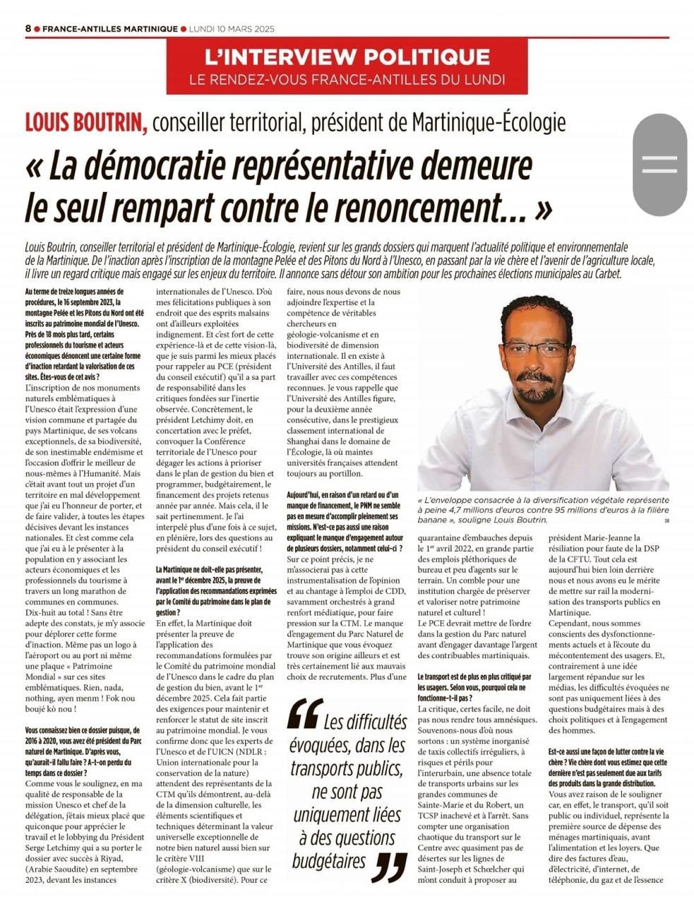 Dans une interview accordée au quotidien FRANCE-ANTILLES, Louis Boutrin, conseiller territorial et président de Martinique-Écologie, revient sur les grands dossiers qui marquent l'actualité politique et environnementale de la Martinique. De l'inaction après l'inscription de la montagne Pelée et des Pitons du Nord à l'Unesco, en passant par la vie chère et l'avenir de l'agriculture locale, il livre un regard critique mais engagé sur les enjeux du territoire. Il annonce sans détour son ambition pour les prochaines élections municipales au Carbet.