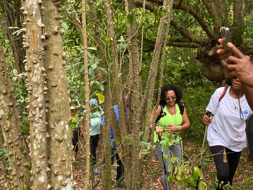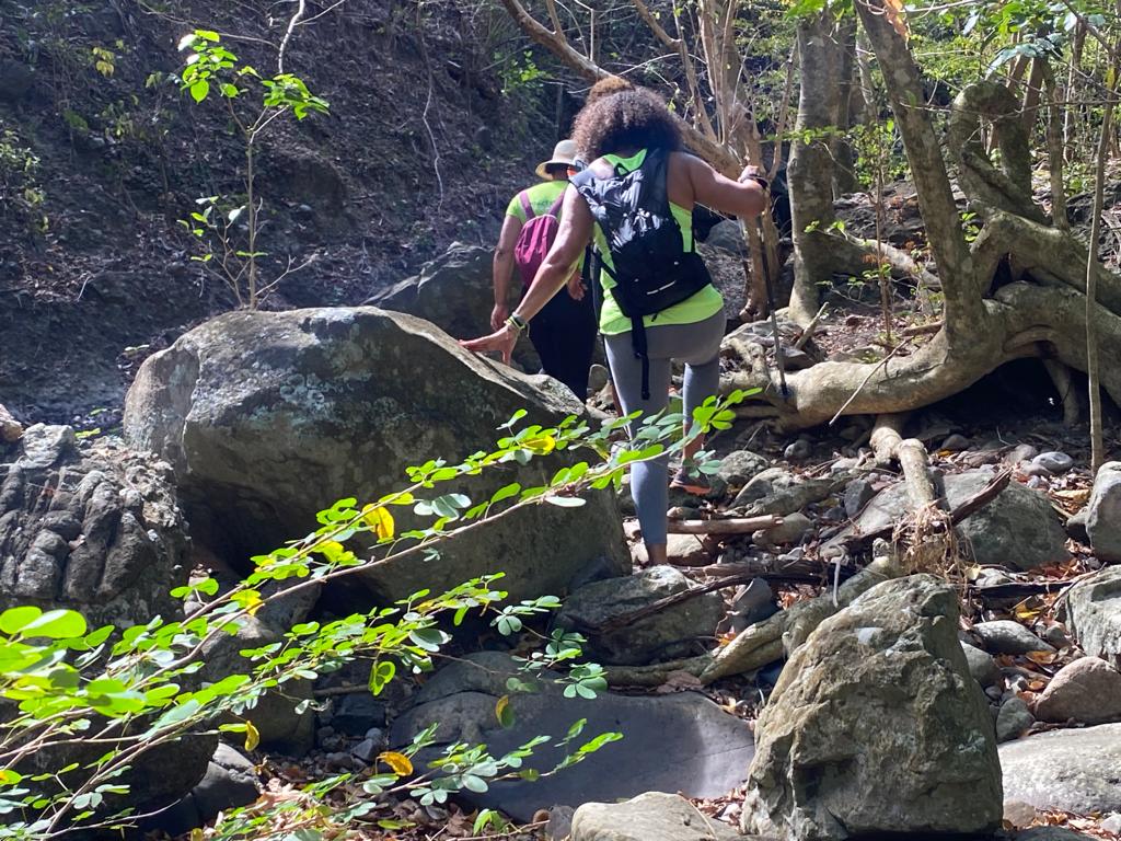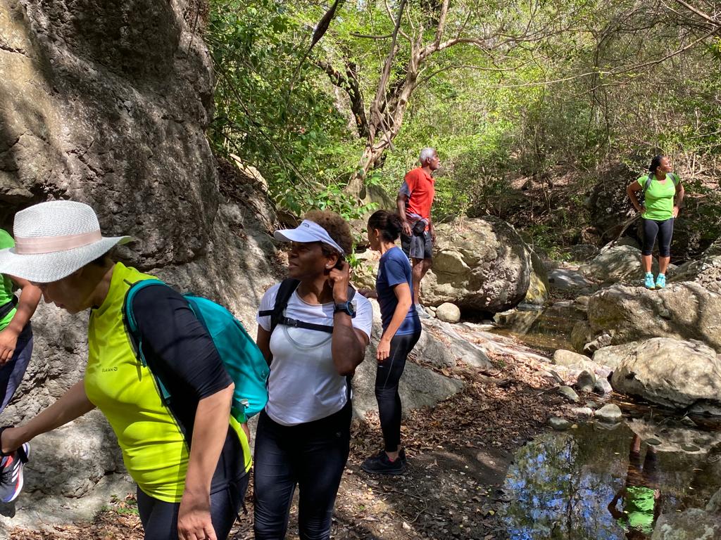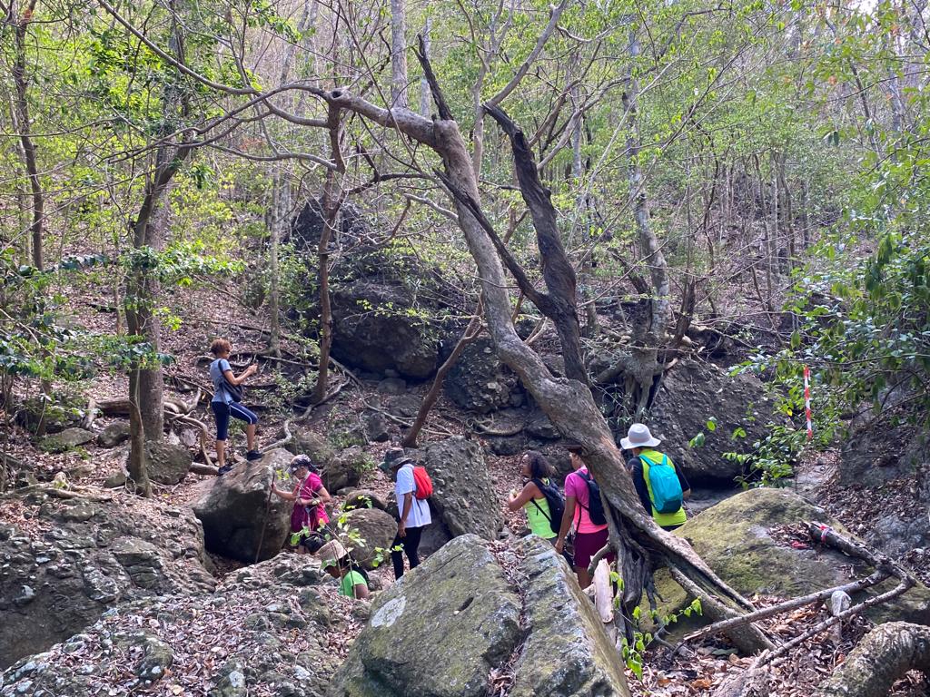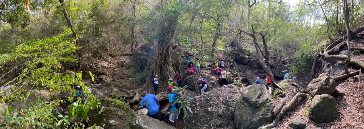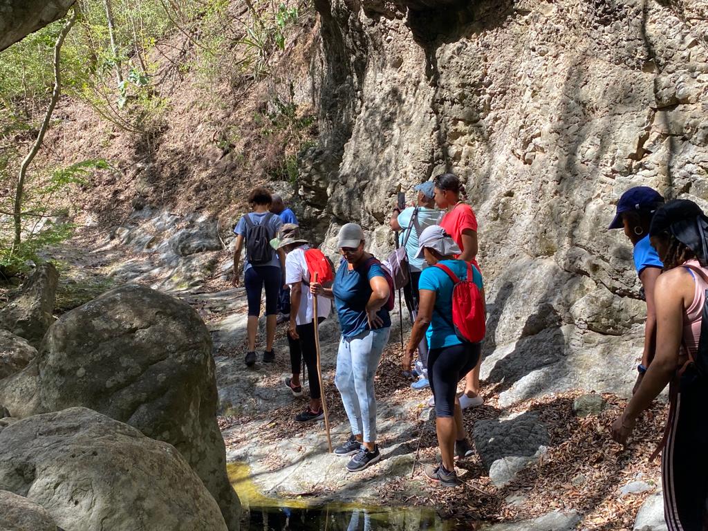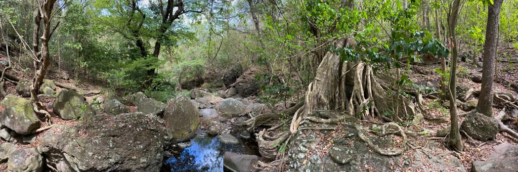 Partis aux aurores, c’est dans ce décor insolite de rivière sèche jalonnée d’impressionnantes falaises et de bombes volcaniques que nos randonneurs ont crapahuté, tantôt au beau mitan de la ravine, tantôt le long d’un sentier tortueux pénétrant dans une végétation qui a du mal à résister à l’aridité du climat. Seules quelques espèces telles les Lépinis, Campêches, Bois Ti-baumes, Fromagers, Poiriers pays et Gommiers rouges parviennent à s’y acclimater et à peupler les lieux. Au détour de zones plus humides, on y découvre un majestueux Mapou et de grands Courbarils qui témoignent bien d’une certaine résilience dans cette forêt sèche particulièrement dégradée.