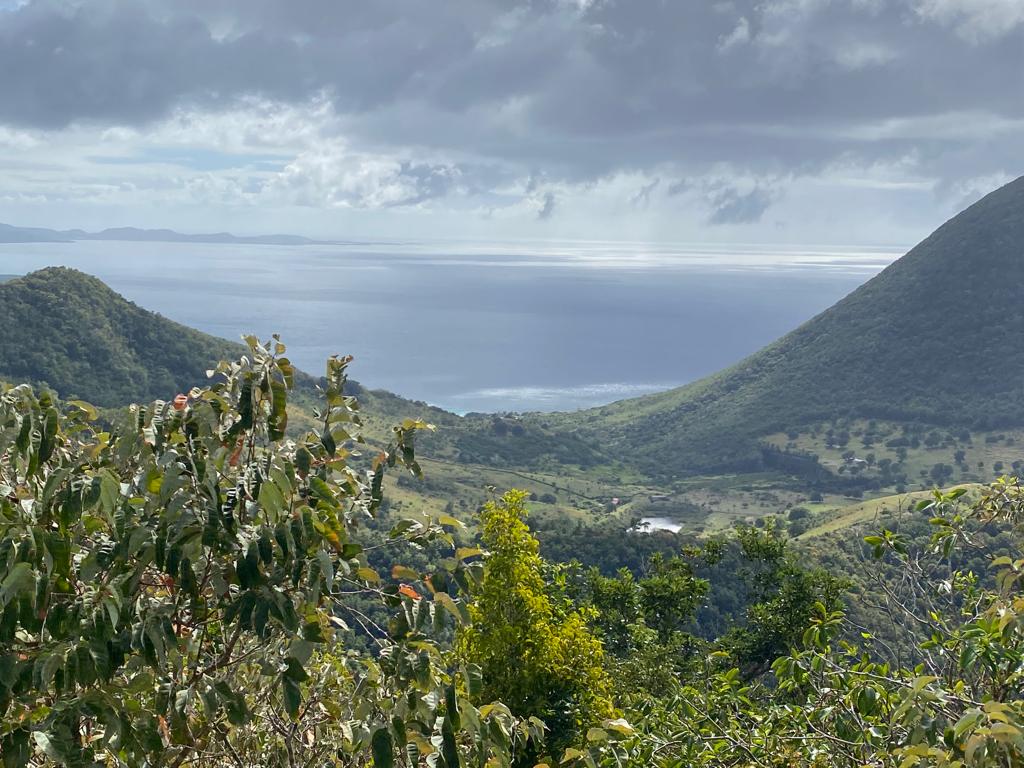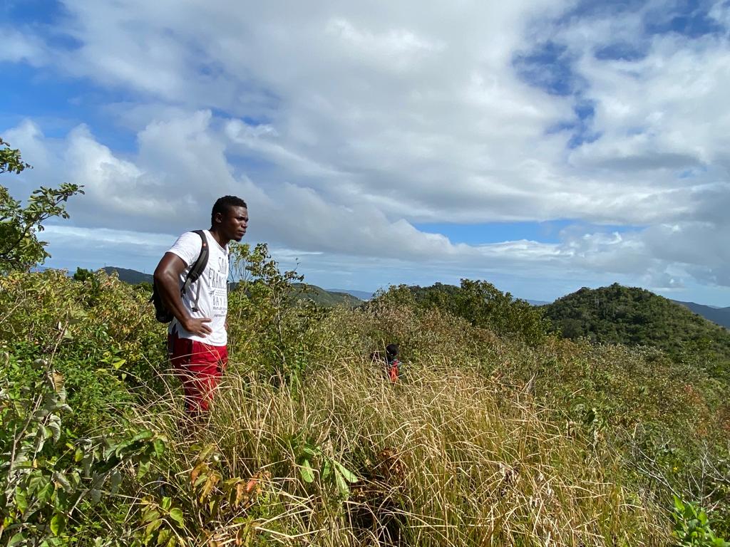 Arrivée tout en haut du Morne Genty, nos efforts ont été récompensés par le spectacle grandiose qui s’offrait à nos yeux. L’azur de la mer s’estompait par la présence de quelques cumulus menaçants emportés par les Alizés. A l’horizon, on devine à peine les contours de Sainte-Lucie débarrassée de ses embruns du matin et revigorée par les premiers éclats du jour.