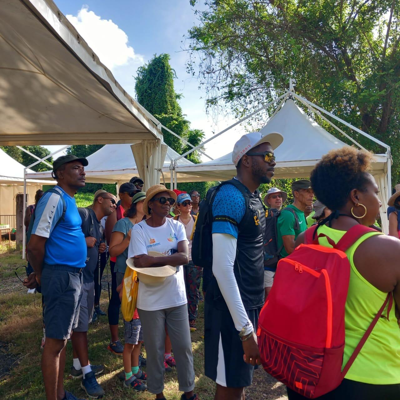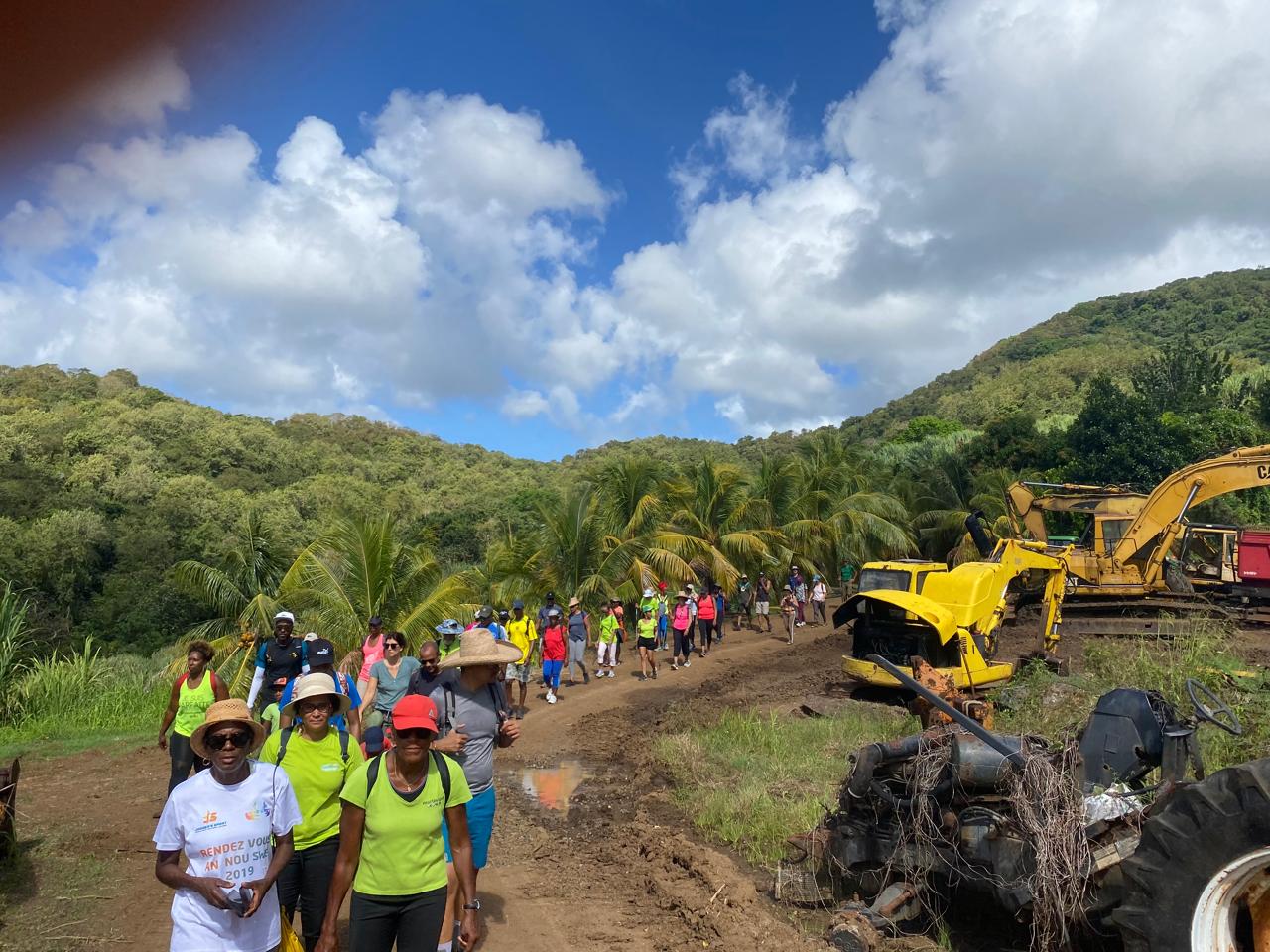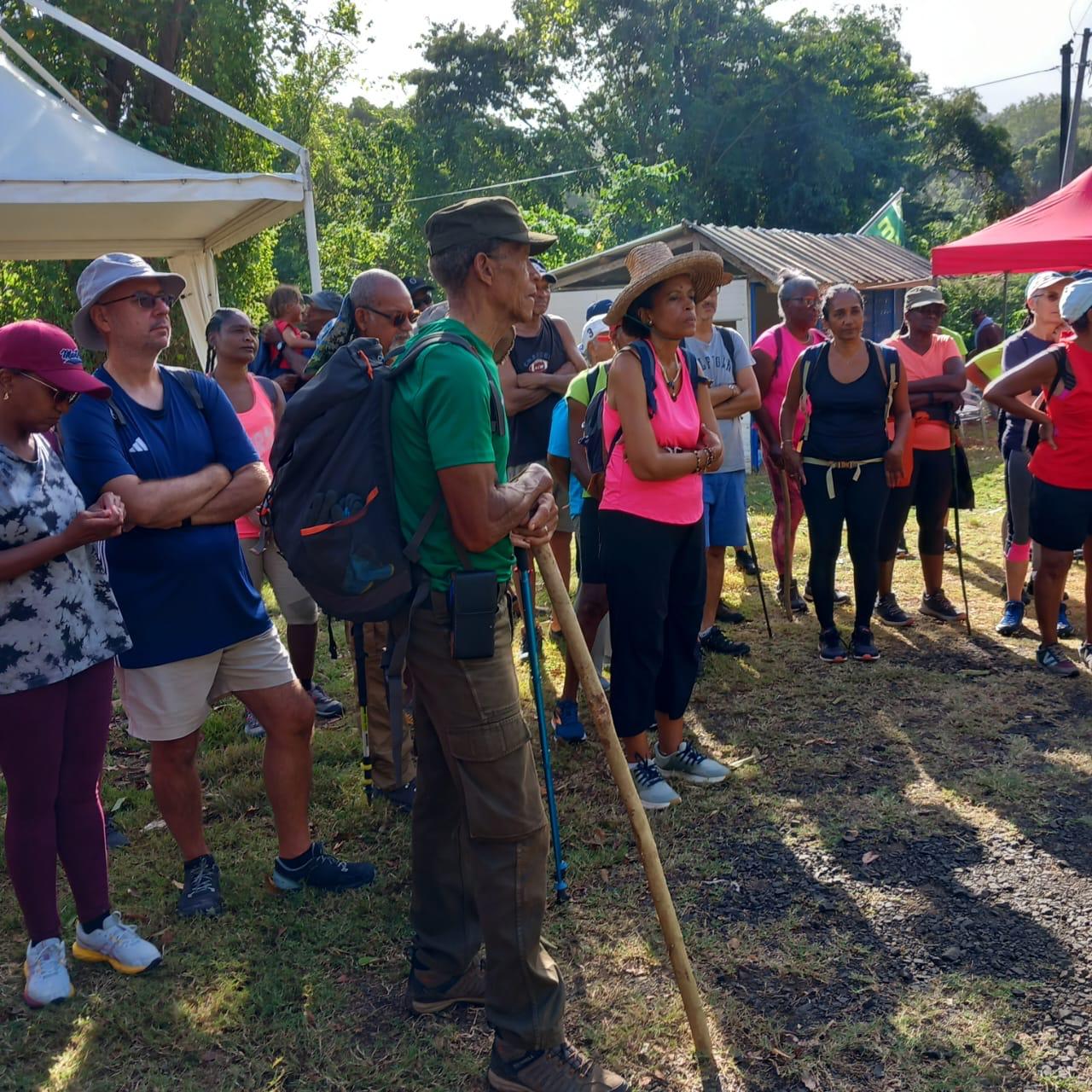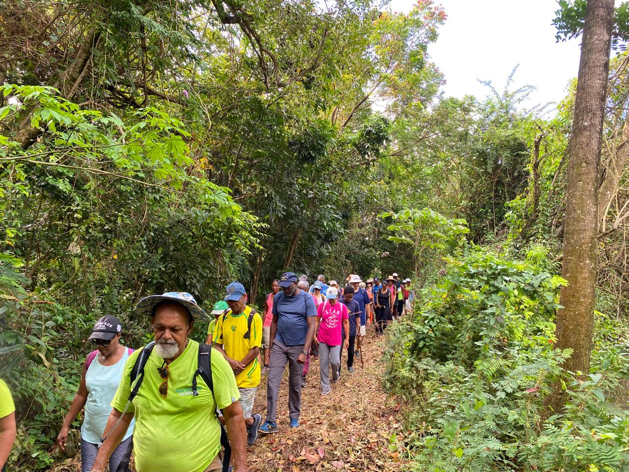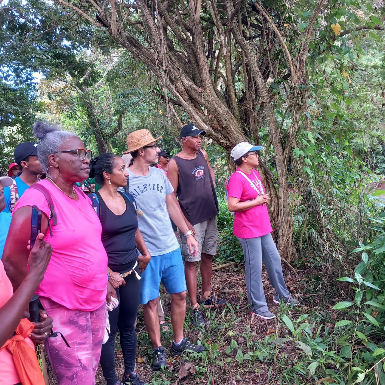 Le Bokantaj 2025 démarra par une escapade pédestre matinale de deux heures à travers champ jusqu’à une immense retenue collinaire au pied de la forêt du morne Camp. Cet ouvrage illustre bien le génie de la paysannerie martiniquaise qui a su exploiter le ruissellement des eaux de pluie par un réseau de canaux collecteurs convergent jusqu’à la mare. Pas moins de 32 exploitations agricoles sont aussi irriguées par un système d’irrigation vertueux. S’en est suivie une courte halte devant la stèle commémoratrice de l’insurrection du Sud de Septembre 1870 où fut déposée une gerbe de fleurs par Romain Bellay, Hervé Zénoky, en compagnie de Maryline Dumanoir, une très discrète militante pilotine, arrière-petite-fille d’Eugène Lacaille, un des leaders de la révolte du Sud. Le nouveau parcours, beaucoup plus accessible, a permis aux 72 randonneurs de découvrir la magnificence des paysages pilotins sauvegardés d’une bétonisation certaine grâce à une mosaïque des cultures ancestrales et contemporaines.