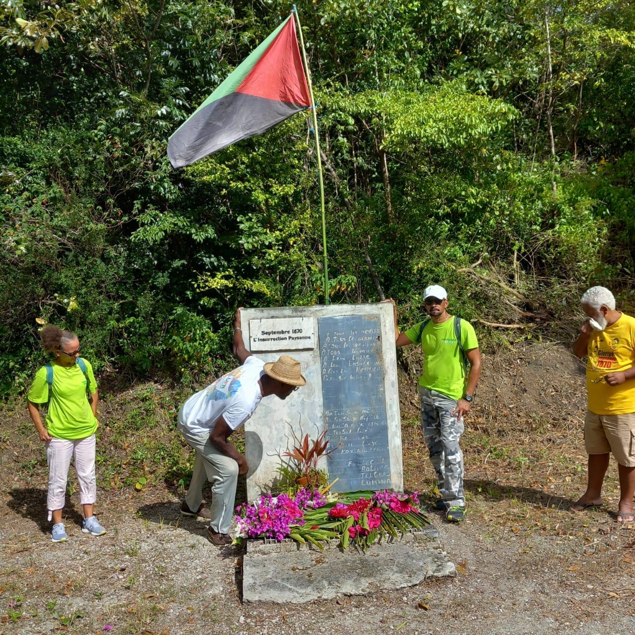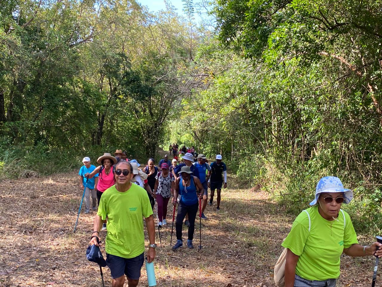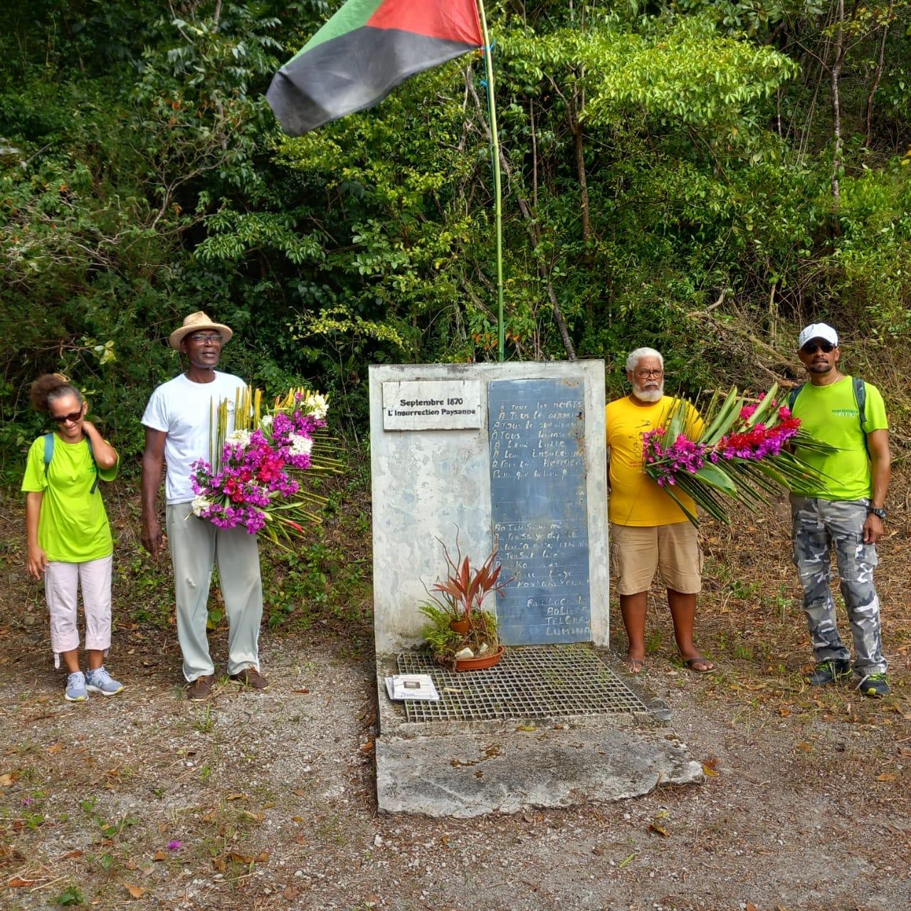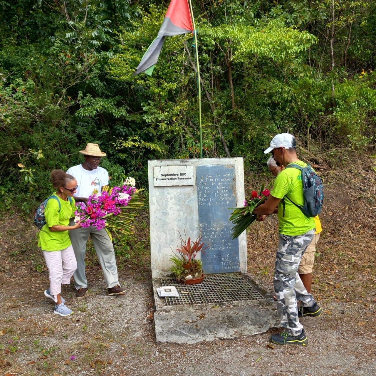 Le Bokantaj 2025 démarra par une escapade pédestre matinale de deux heures à travers champ jusqu’à une immense retenue collinaire au pied de la forêt du morne Camp. Cet ouvrage illustre bien le génie de la paysannerie martiniquaise qui a su exploiter le ruissellement des eaux de pluie par un réseau de canaux collecteurs convergent jusqu’à la mare. Pas moins de 32 exploitations agricoles sont aussi irriguées par un système d’irrigation vertueux. S’en est suivie une courte halte devant la stèle commémoratrice de l’insurrection du Sud de Septembre 1870 où fut déposée une gerbe de fleurs par Romain Bellay, Hervé Zénoky, en compagnie de Maryline Dumanoir, une très discrète militante pilotine, arrière-petite-fille d’Eugène Lacaille, un des leaders de la révolte du Sud. Le nouveau parcours, beaucoup plus accessible, a permis aux 72 randonneurs de découvrir la magnificence des paysages pilotins sauvegardés d’une bétonisation certaine grâce à une mosaïque des cultures ancestrales et contemporaines.