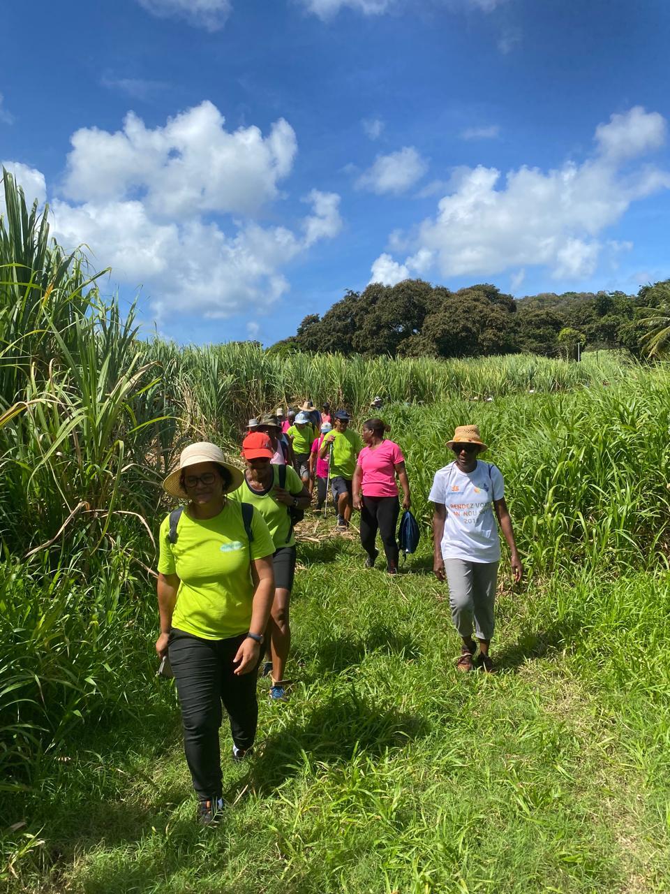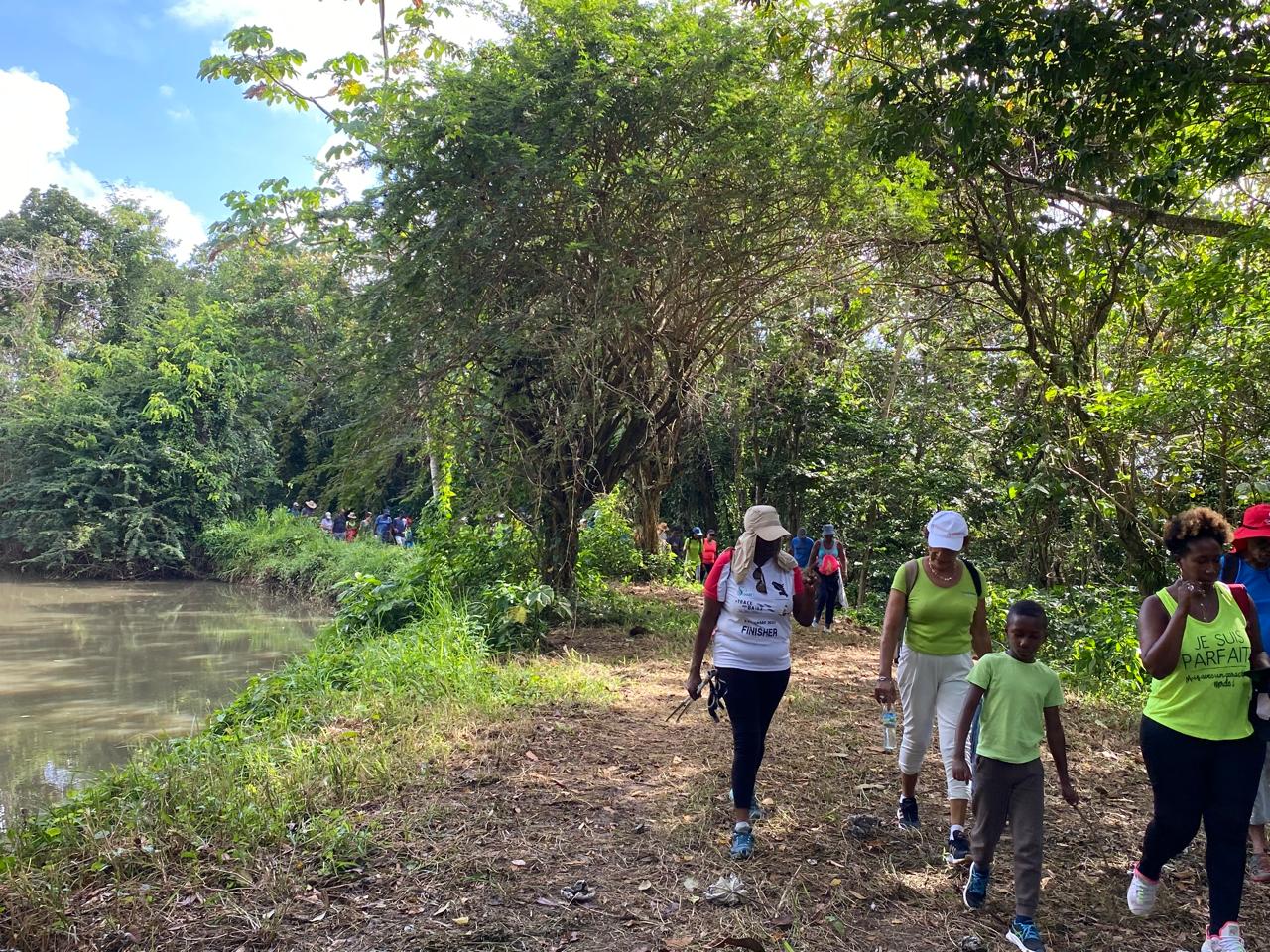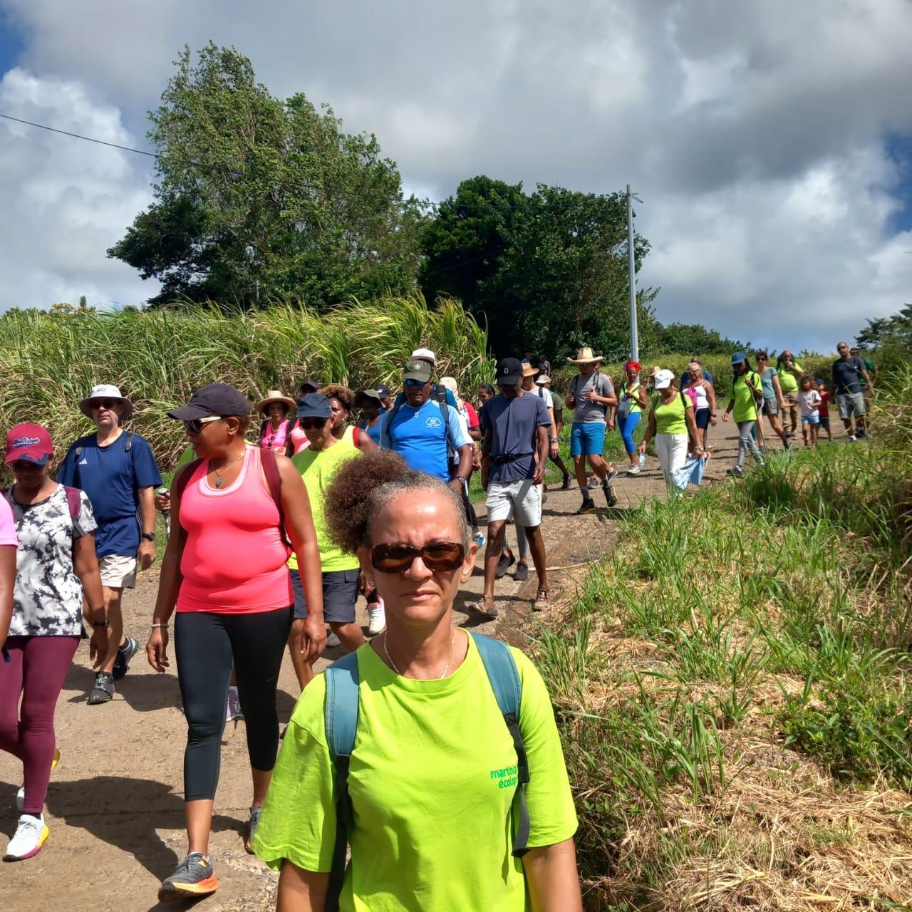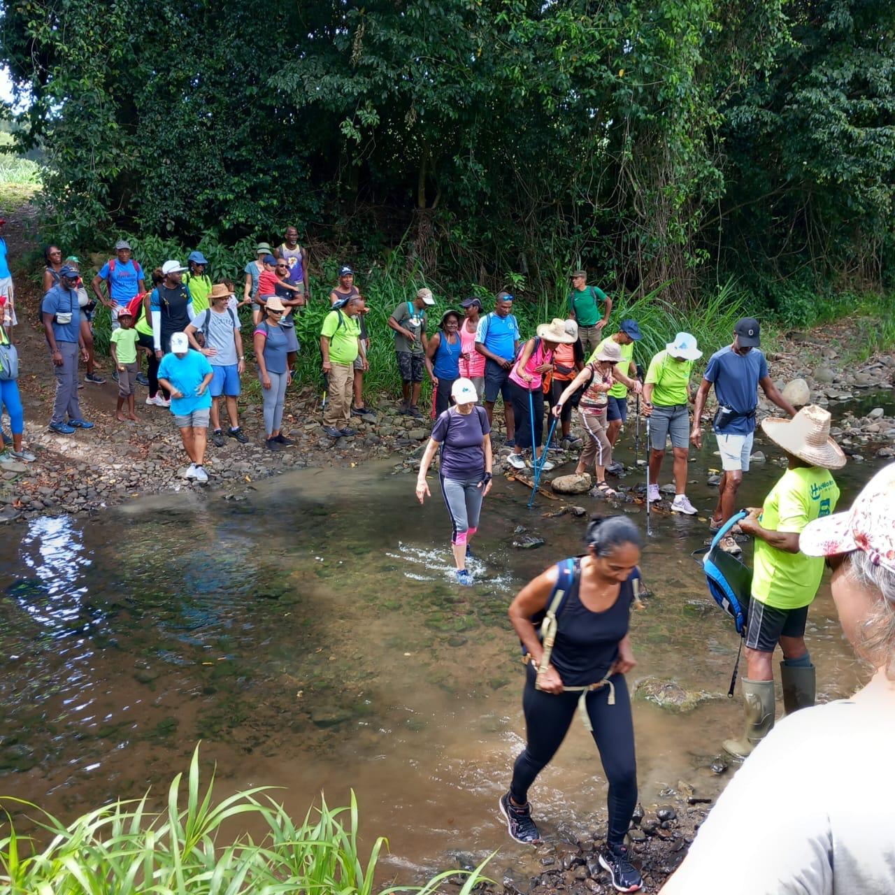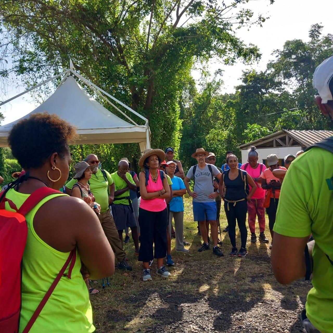 Le Bokantaj 2025 démarra par une escapade pédestre matinale de deux heures à travers champ jusqu’à une immense retenue collinaire au pied de la forêt du morne Camp. Cet ouvrage illustre bien le génie de la paysannerie martiniquaise qui a su exploiter le ruissellement des eaux de pluie par un réseau de canaux collecteurs convergent jusqu’à la mare. Pas moins de 32 exploitations agricoles sont aussi irriguées par un système d’irrigation vertueux. S’en est suivie une courte halte devant la stèle commémoratrice de l’insurrection du Sud de Septembre 1870 où fut déposée une gerbe de fleurs par Romain Bellay, Hervé Zénoky, en compagnie de Maryline Dumanoir, une très discrète militante pilotine, arrière-petite-fille d’Eugène Lacaille, un des leaders de la révolte du Sud. Le nouveau parcours, beaucoup plus accessible, a permis aux 72 randonneurs de découvrir la magnificence des paysages pilotins sauvegardés d’une bétonisation certaine grâce à une mosaïque des cultures ancestrales et contemporaines.