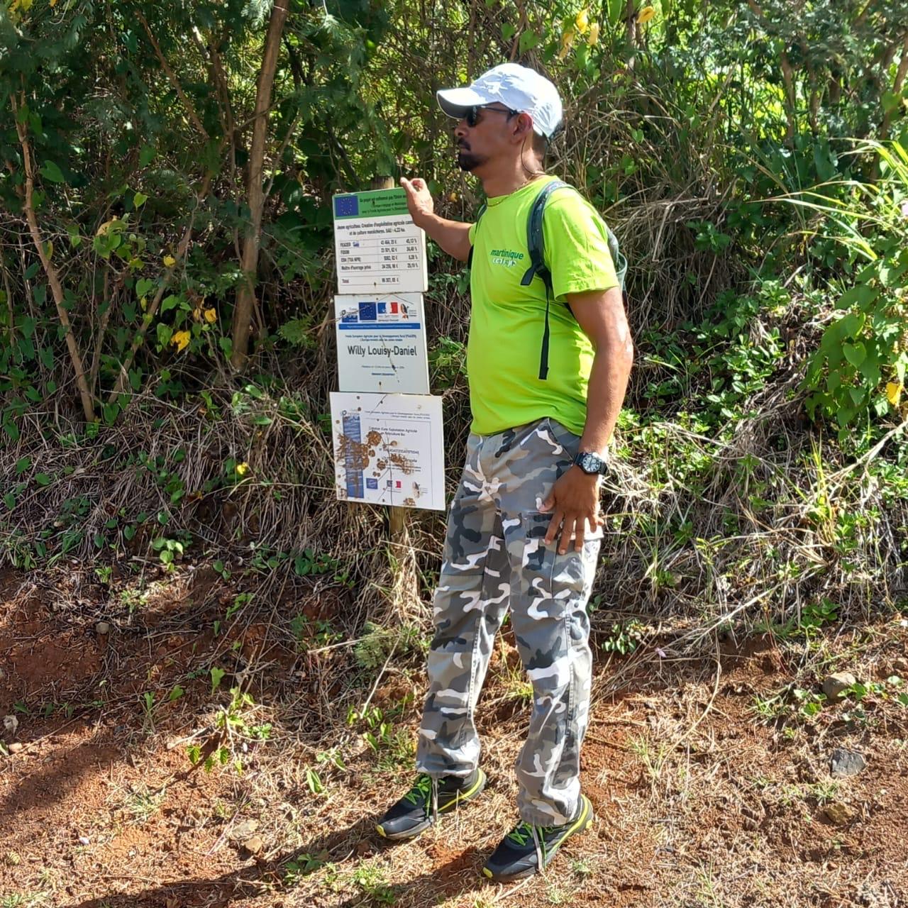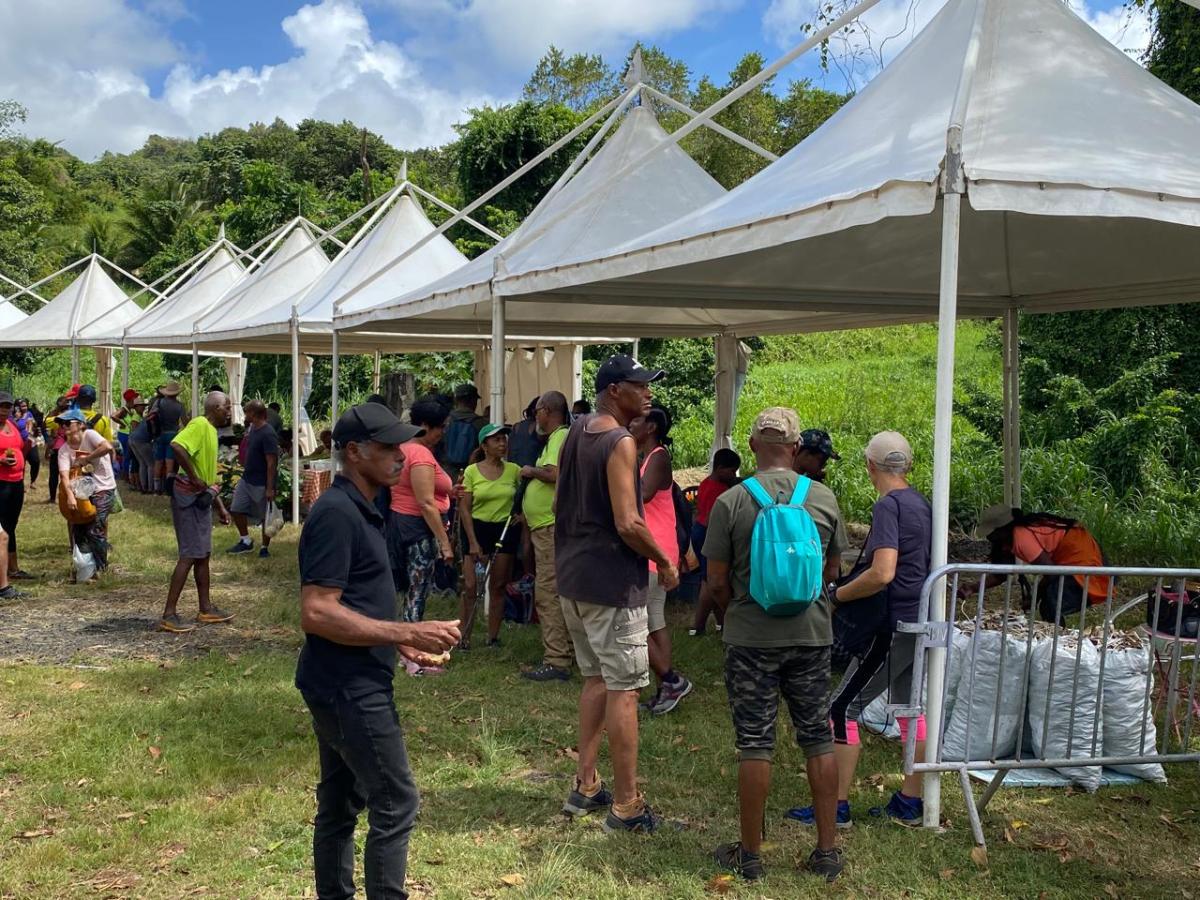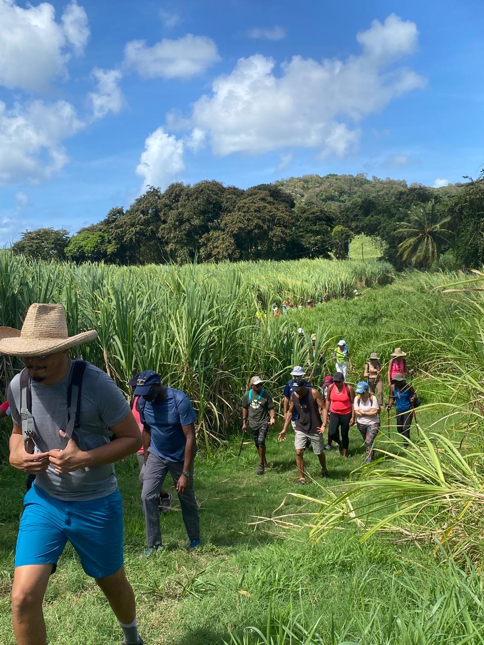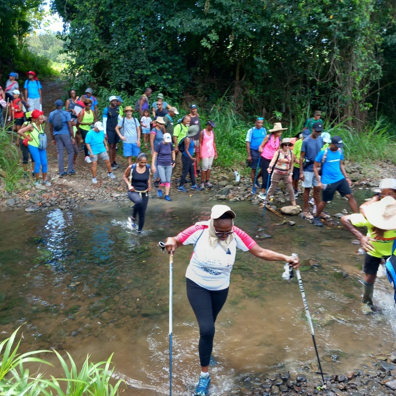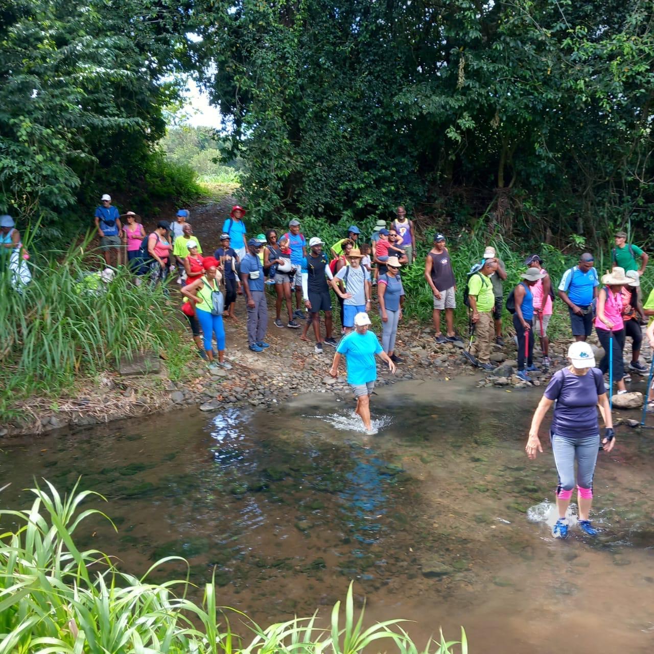 Le Bokantaj 2025 démarra par une escapade pédestre matinale de deux heures à travers champ jusqu’à une immense retenue collinaire au pied de la forêt du morne Camp. Cet ouvrage illustre bien le génie de la paysannerie martiniquaise qui a su exploiter le ruissellement des eaux de pluie par un réseau de canaux collecteurs convergent jusqu’à la mare. Pas moins de 32 exploitations agricoles sont aussi irriguées par un système d’irrigation vertueux. S’en est suivie une courte halte devant la stèle commémoratrice de l’insurrection du Sud de Septembre 1870 où fut déposée une gerbe de fleurs par Romain Bellay, Hervé Zénoky, en compagnie de Maryline Dumanoir, une très discrète militante pilotine, arrière-petite-fille d’Eugène Lacaille, un des leaders de la révolte du Sud. Le nouveau parcours, beaucoup plus accessible, a permis aux 72 randonneurs de découvrir la magnificence des paysages pilotins sauvegardés d’une bétonisation certaine grâce à une mosaïque des cultures ancestrales et contemporaines.