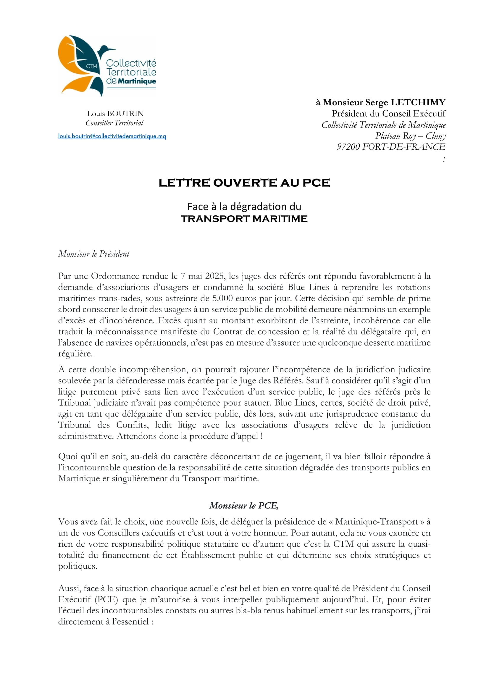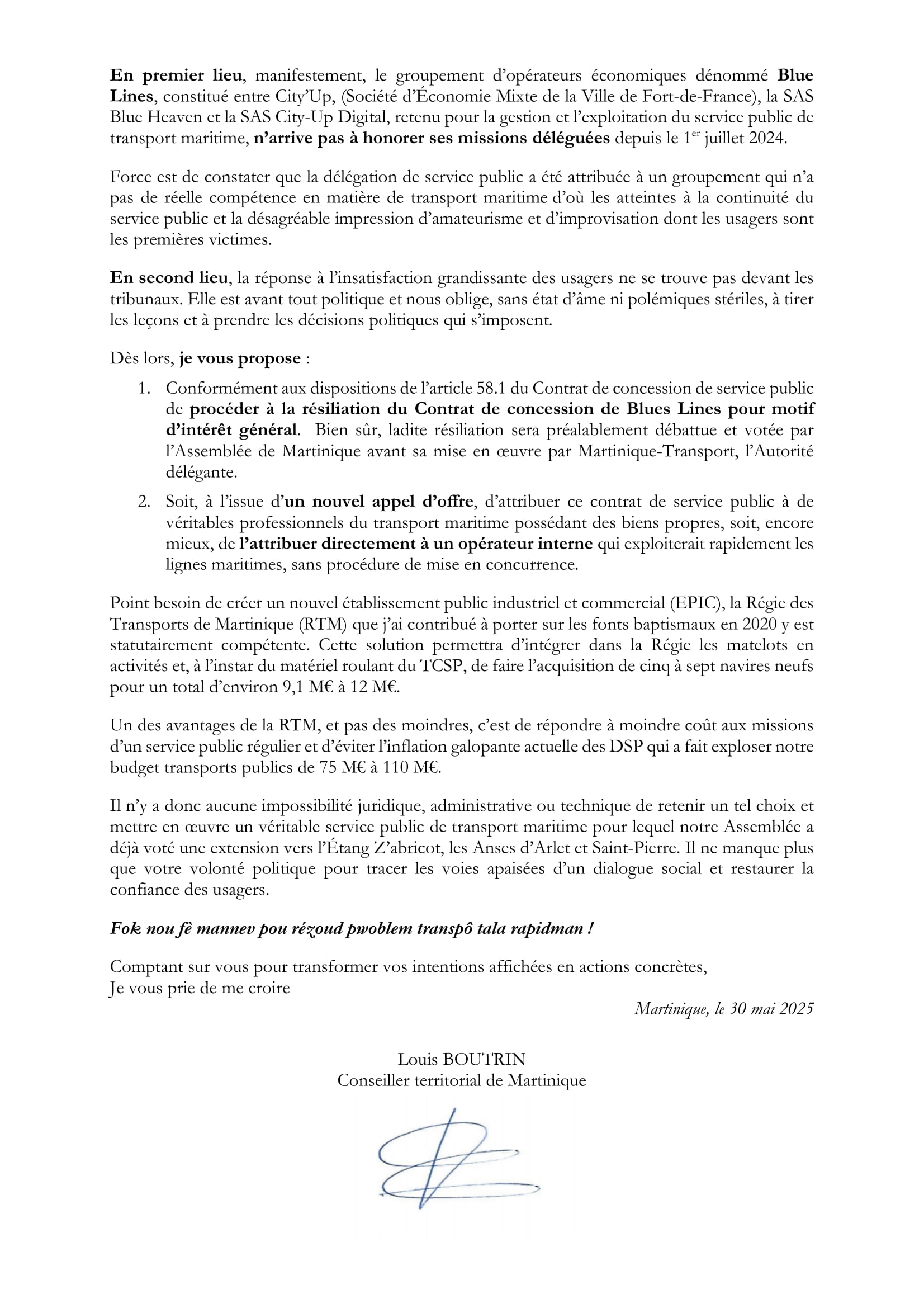 Martinique - 30 mai 2025. Face à la dégradation des transports maritimes et à la saisine des Tribunaux par les usagers, le Conseiller territorial Louis BOUTRIN demande au Président du Conseil Exécutif de procéder à la résiliation du Contrat de concession de service public de BLUE LINES pour motif d'intérêt général. L'ex-Conseiller exécutif en charge des Transports (2016-2021) propose au PCE soit de lancer une nouvelle consultation pour attribuer ledit Contrat à de véritables professionnels du transport maritime possédant des biens propres (BLUE LINES ne possède aucun bateau !) soit de l'attribuer directement à un opérateur interne (la régie RTM) qui exploiterait rapidement les lignes maritimes, sans procédures de mise en concurrence.