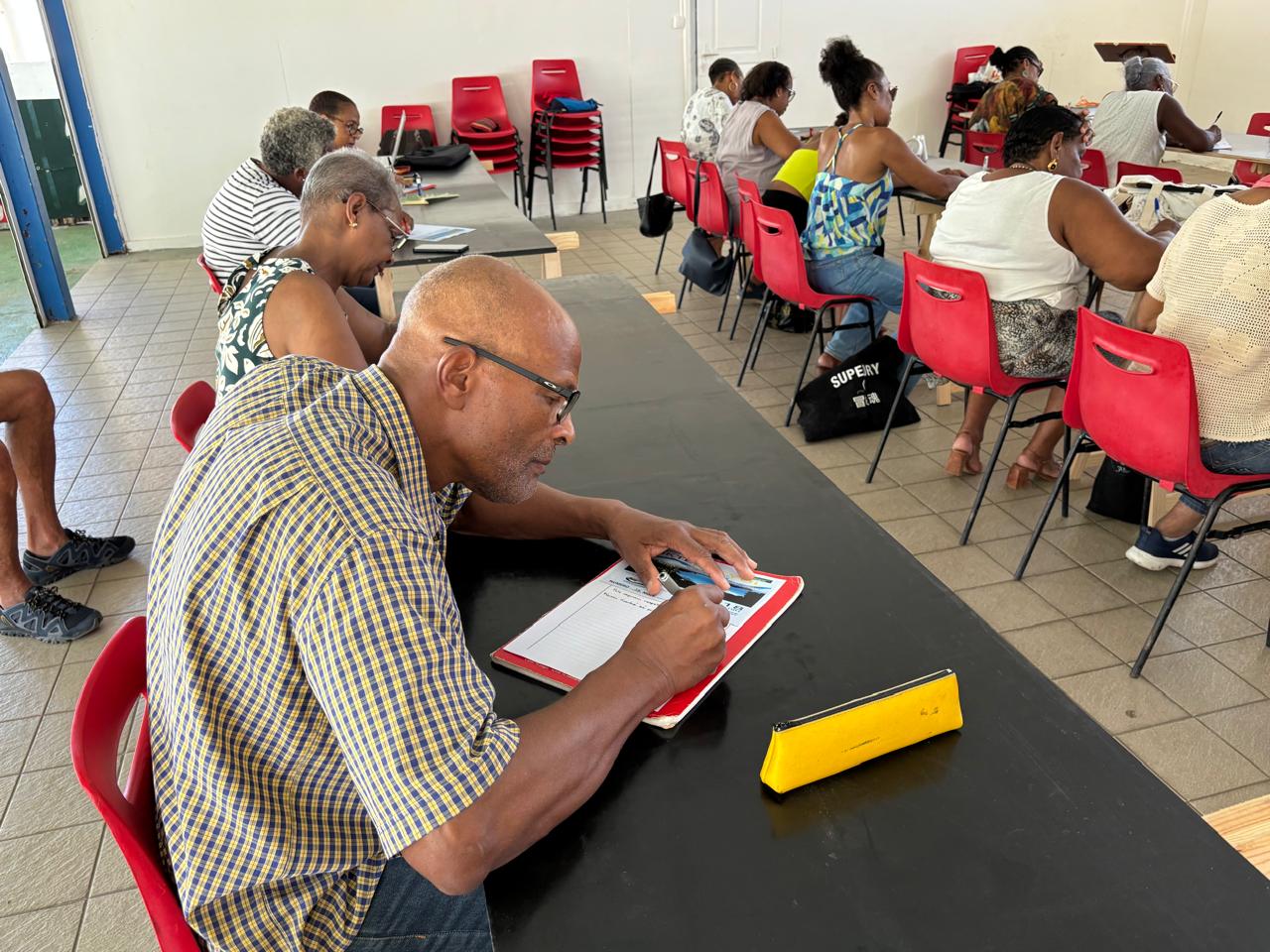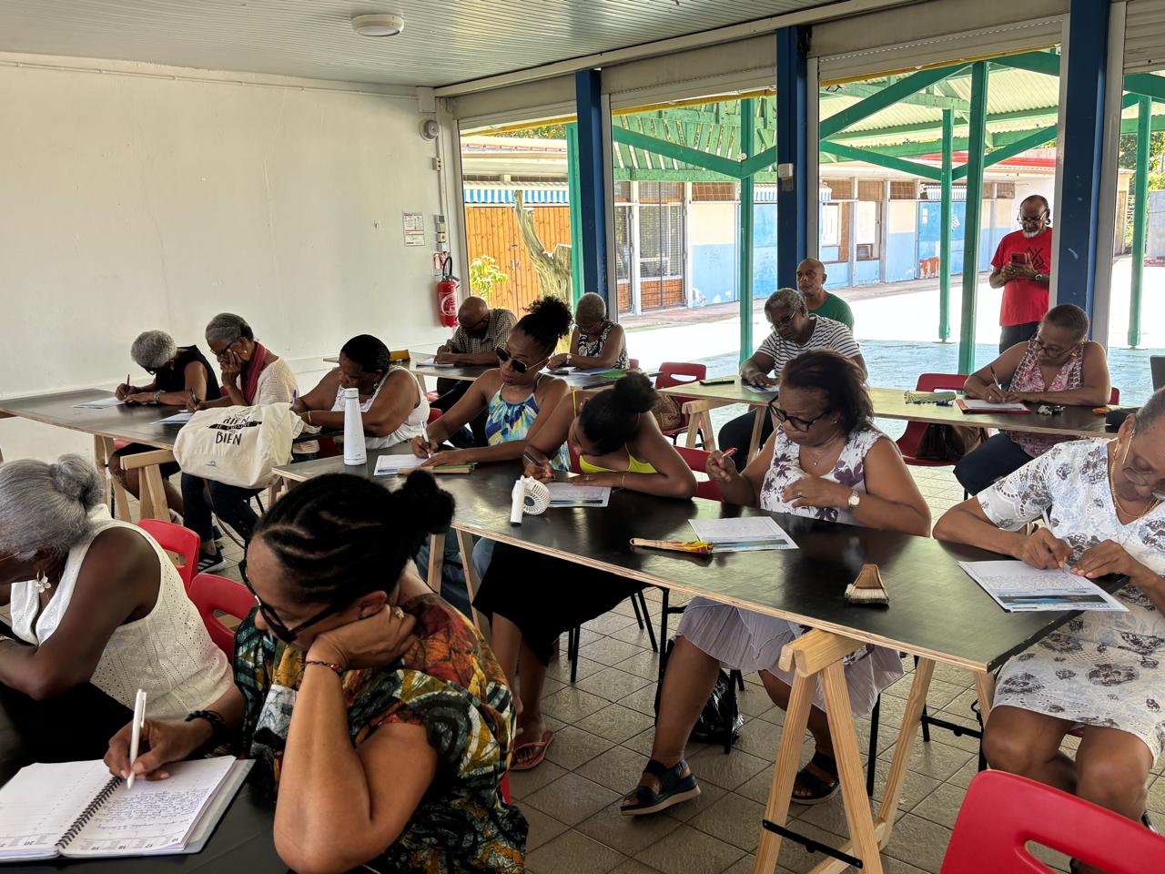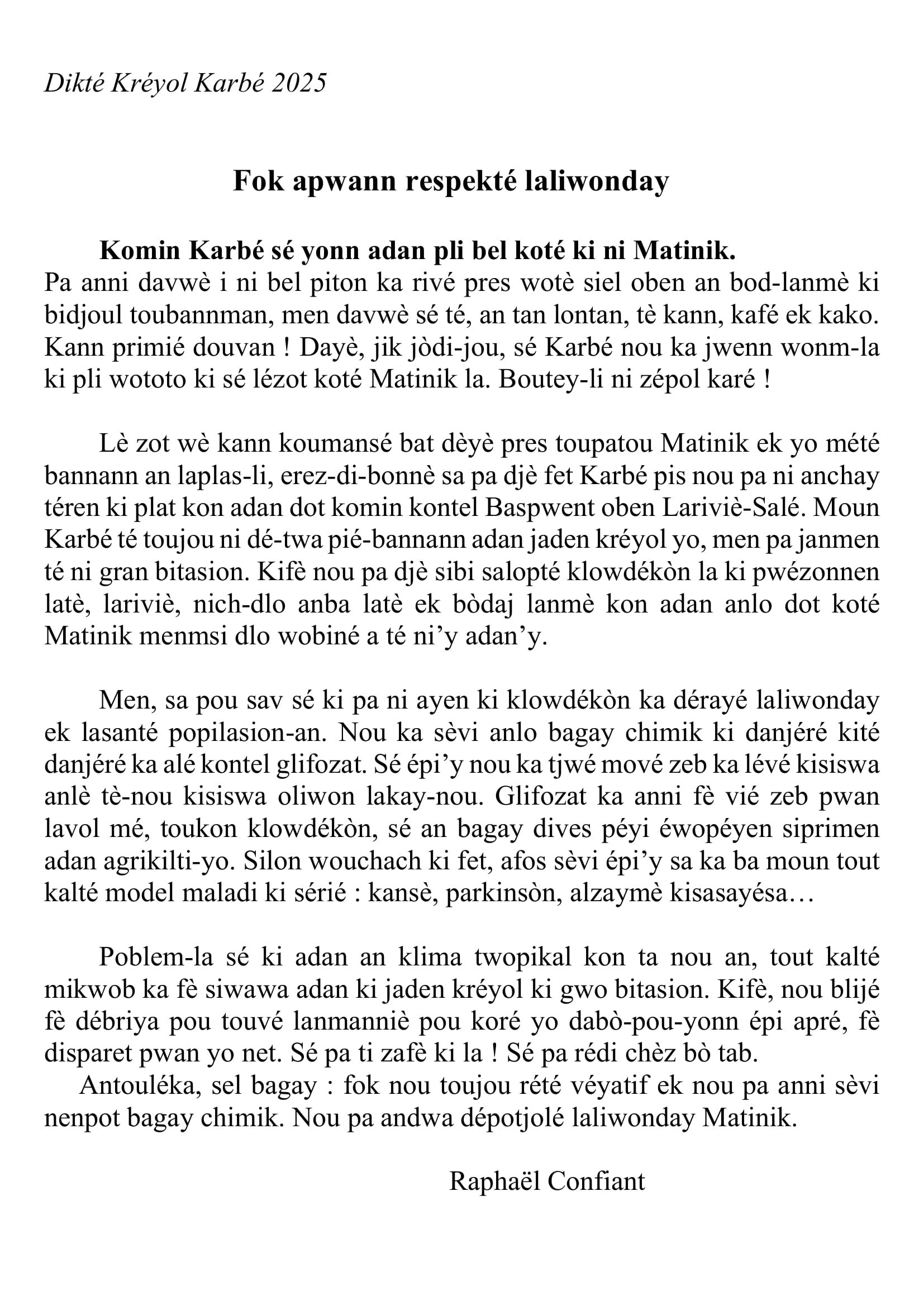Karbet - EAC Bòd Lanmè – Sanmdi 18 oktob 2025. 10è bonmaten. « Komin Karbé sé yonn adan pli bel koté ki ni Matinik ». C’est par ces mots laudateurs de l’écrivain Raphaël Confiant que les participants ont planché sur la dikté kréyol 2025 organisée par Martinique-Écologie en partenariat avec la Ville du Carbet (Remerciements). Un texte très inspirant, empli de nuances et d’images évocatrices, qui a tenu en haleine les auditeurs d’un jour au moment même où la commune enterrait Christian Frédal, Carbétien dans l’âme, un homme d’une grande générosité dont la disparition a précipité bon nombre de concitoyens à sa cérémonie funéraire (RIP - Condoléances à la famille).