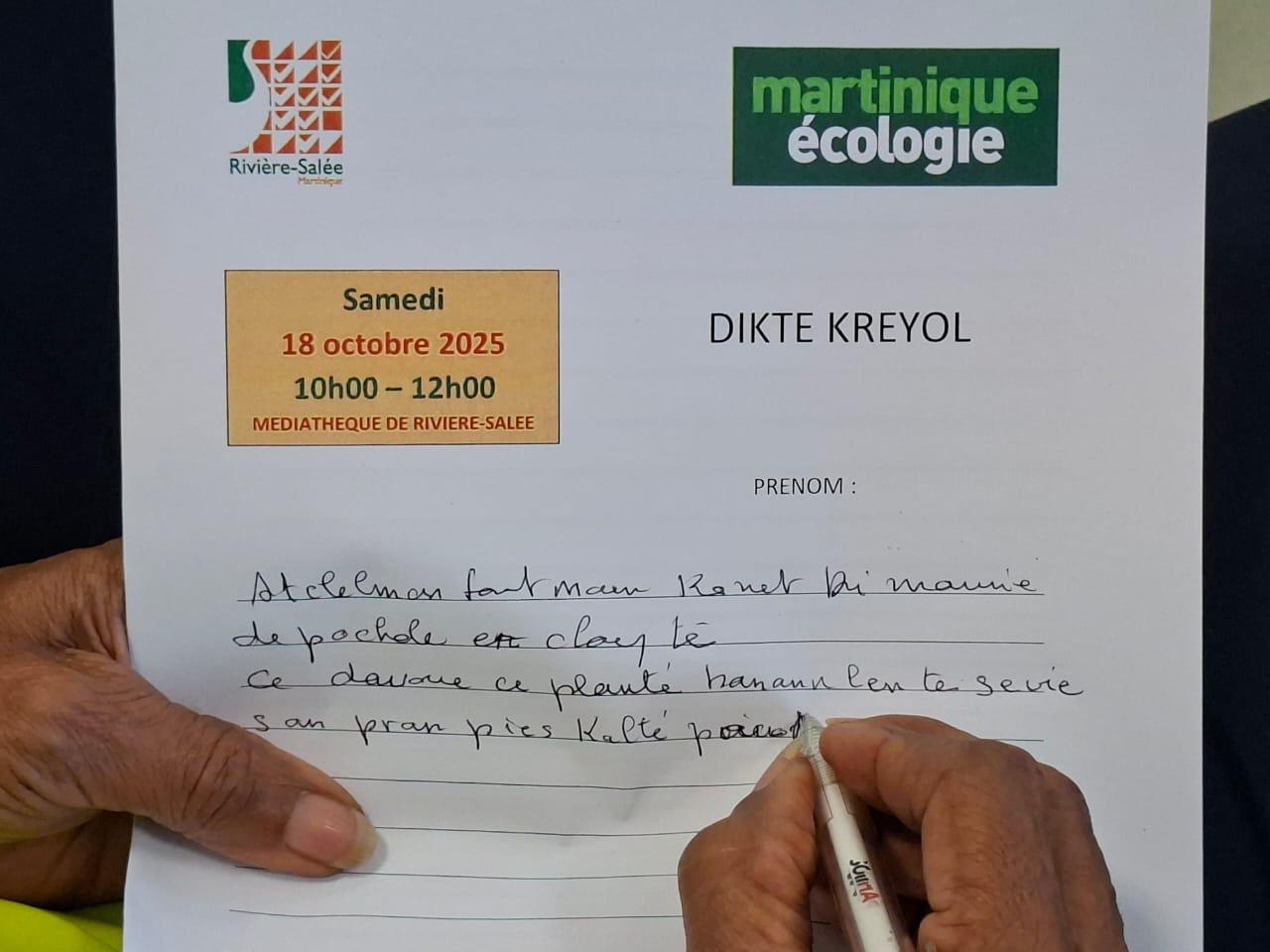 LAVIL RIVIÈ-SALÉ - 18 Oktob 2025. C’est dans l’enceinte apaisant de la médiathèque de Rivière-Salée que s’est tenue la DIKTÉ KRÉYOL 2025 organisée par MARTINIQUE-ÉCOLOGIE en partenariat avec la VILLE DE RIVIÈRE-SALÉE. Orchestrée d’une main de maître par la saléenne Marie-Anne Joseph, étudiante en Master de langue et culture créoles à l’Université des Antilles, cette édition a connu un vif succès où la dictrice, Jane Étienne, a tenu en haleine les 41 participants, très réceptifs et tous avides de perfectionner leur langue maternelle.